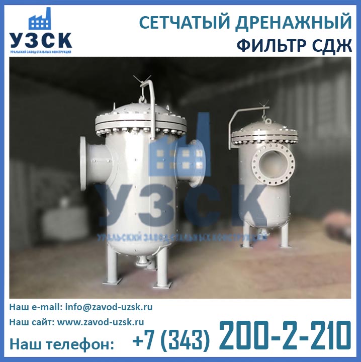 На формирование цены дренажного фильтра влияют следующие факторы: материальное исполнение, конструктивное исполнение, стоимость сырья в момент изготовления, комплектация, необходимость доставки в другой населенный пункт, срочность выполнения работ по изготовлению, прочие предпочтения заказчика. Уральский завод стальных конструкций изготавливает фильтры СДЖ-700 любого типового исполнения, а также нестандартные фильтры СДЖ 700 мм по чертежам заказчика или техническому заданию. Дополнительно к фильтрам СДЖ у нас Вы можете заказать сменные фильтрующие элементы любой тонкости фильтрации, ответные фланцы, прокладки и крепеж. По запросу изготавливаем также фильтры СДЖ-К-700 с концевым затвором. Для того чтобы узнать какова цена на фильтр СДЖ Ду700 в Нижнекамске с необходимыми Вам характеристиками, отправьте запрос в отдел продаж завода УЗСК по координатам, указанным в разделе «Контакты».